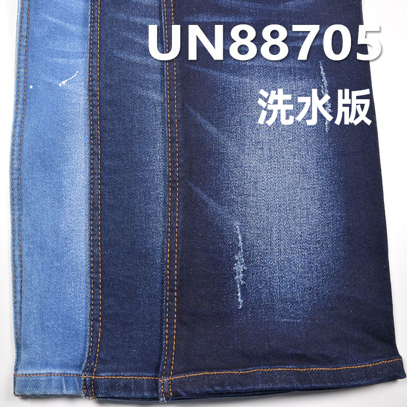 This is a T400 dual-core stretch twill denim fabric.It's a denim material composed of 2.5% Lycra, 93.5% cotton, and 4% T400, with a weight of 12.5oz and a width of 52/54 inches. The main finishing processes are "T400 dual-core stretch + twill denim," and the article number is UN88705.This dual-core stretch denim fabric offers a soft handfeel, clear texture, and is high-quality and fashionable. The premium Lycra fibers provide it with outstanding elasticity. It is commonly used for manufacturing stretch denim jeans, casual denim jackets, and other garments.