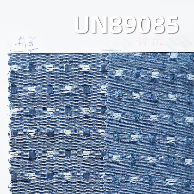 This is a 4.5oz Cotton Polyester Jacquard Small Check Denim Fabric.It is a denim fabric composed of 61% Cotton and 39% Polyester, weighing 4.5oz with a width of 58/59". The main processes are "Small Check + Jacquard Denim". The article number is UN89085.This denim fabric offers a soft handfeel, is lightweight and breathable. The blue and white small check jacquard design is fresh and versatile. In the textile market, it is commonly used for denim skirts, denim shirts, and more.